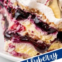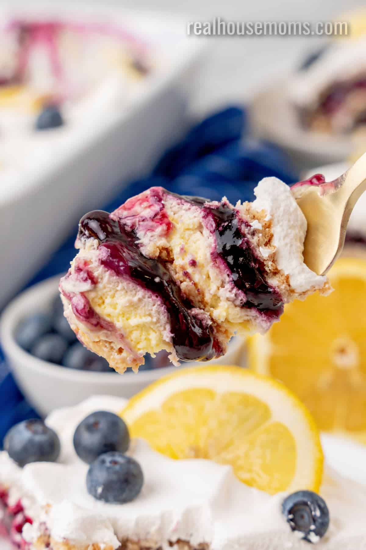 Yes, 3 cups of fresh blueberries can work as a swap if you want a less-sweet, more natural, fruit-forward flavor. The biggest difference is texture, since blueberry pie filling creates a softer, more cohesive layer, while fresh berries make the fruit layer a little lighter and the slices slightly less defined.