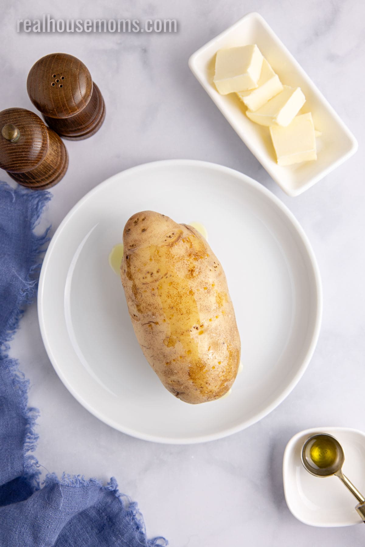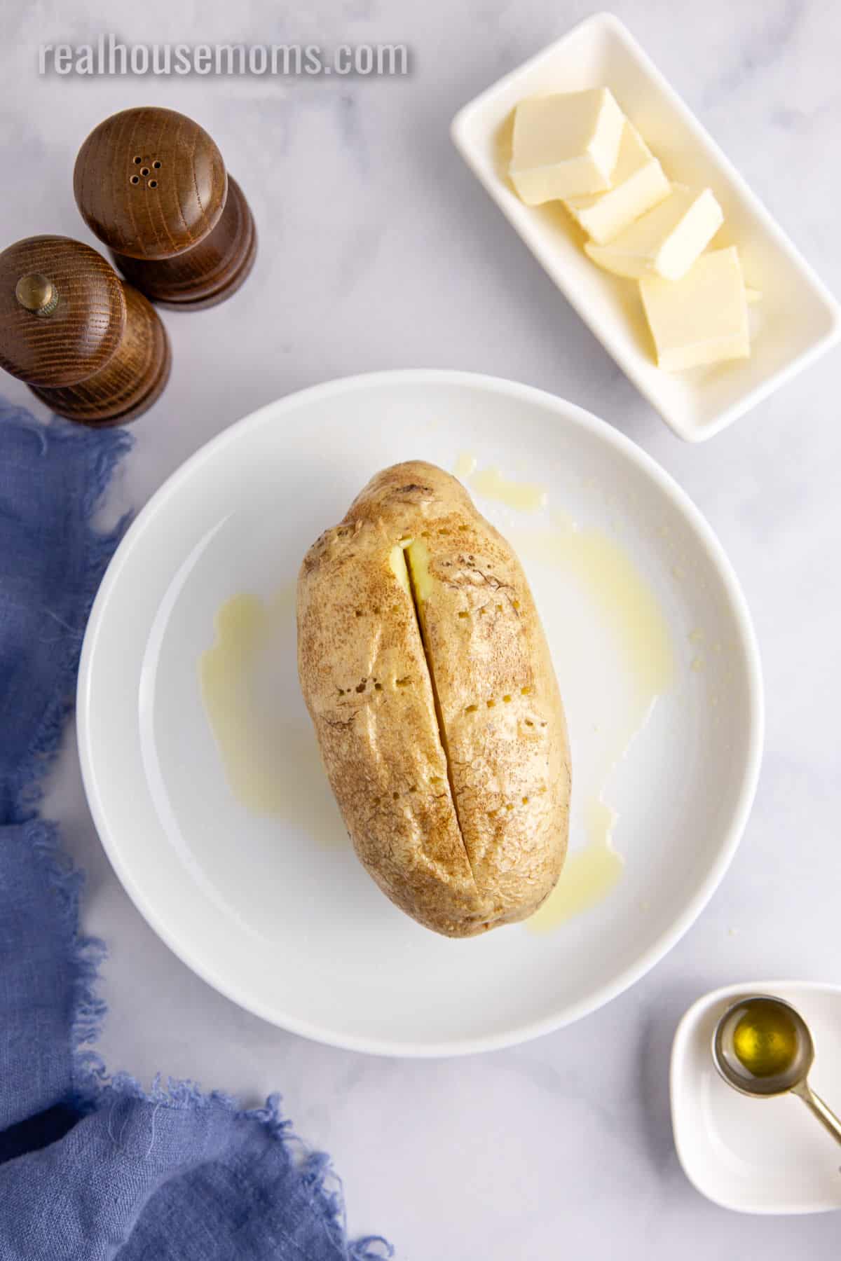Oil: For a crispy skin, rub the uncooked potato with a teaspoon of oil. Any oil will work, though olive oil has the best subtle flavor.