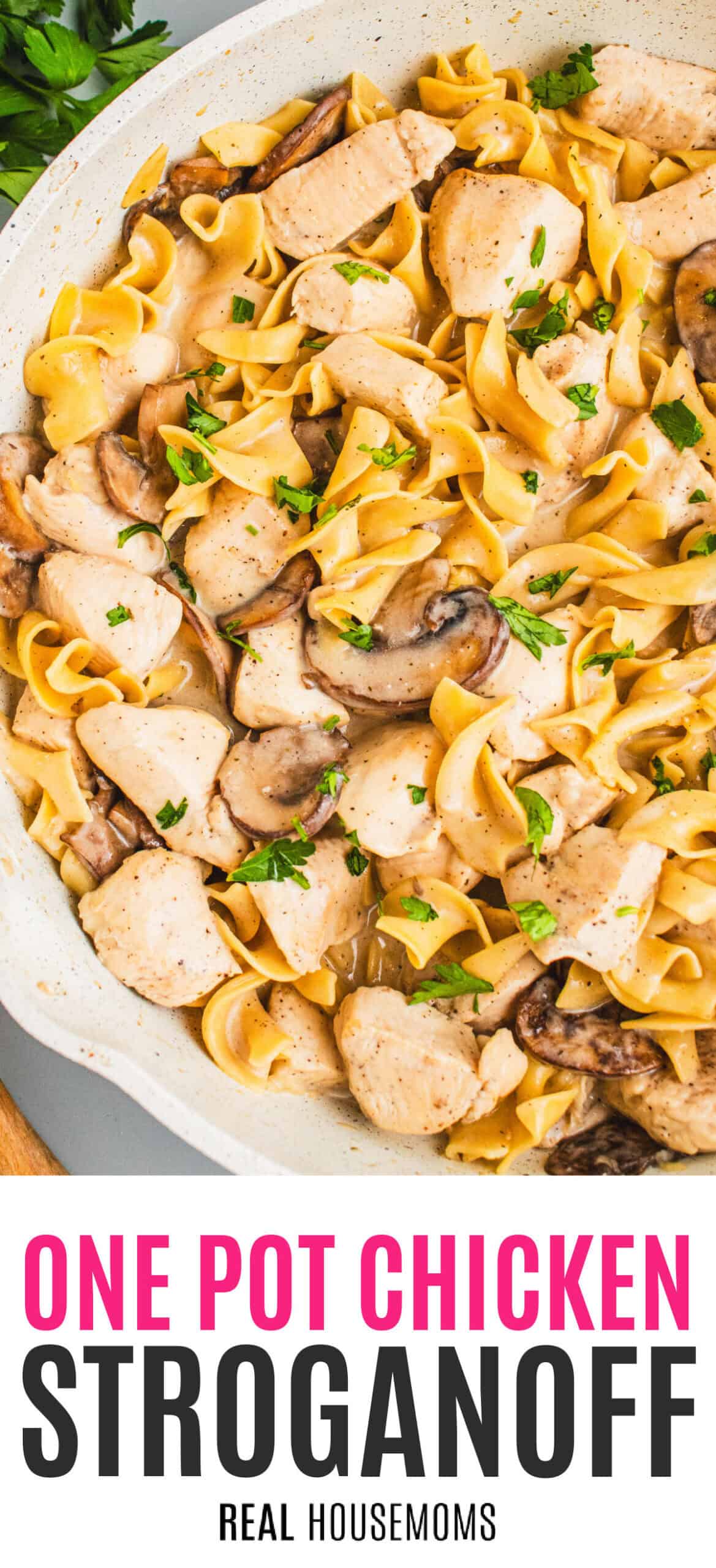 Chicken stroganoff is an easy one-pan dinner with chicken, mushrooms, and egg noodles cooked right in the creamy sauce in 30 minutes.