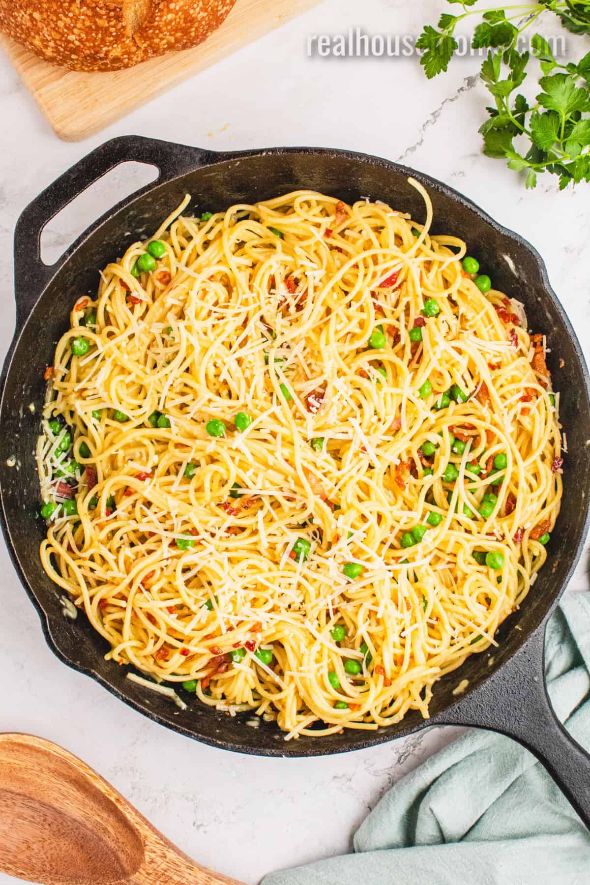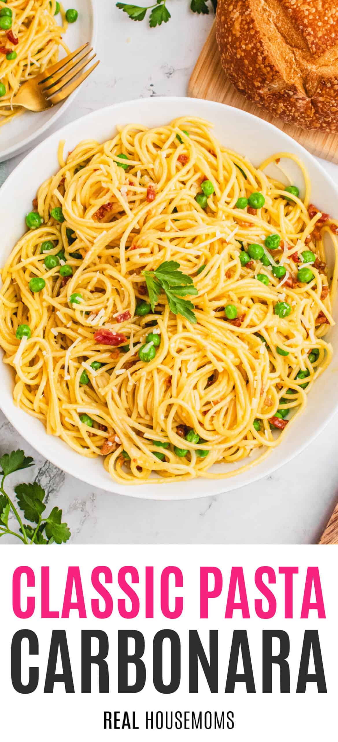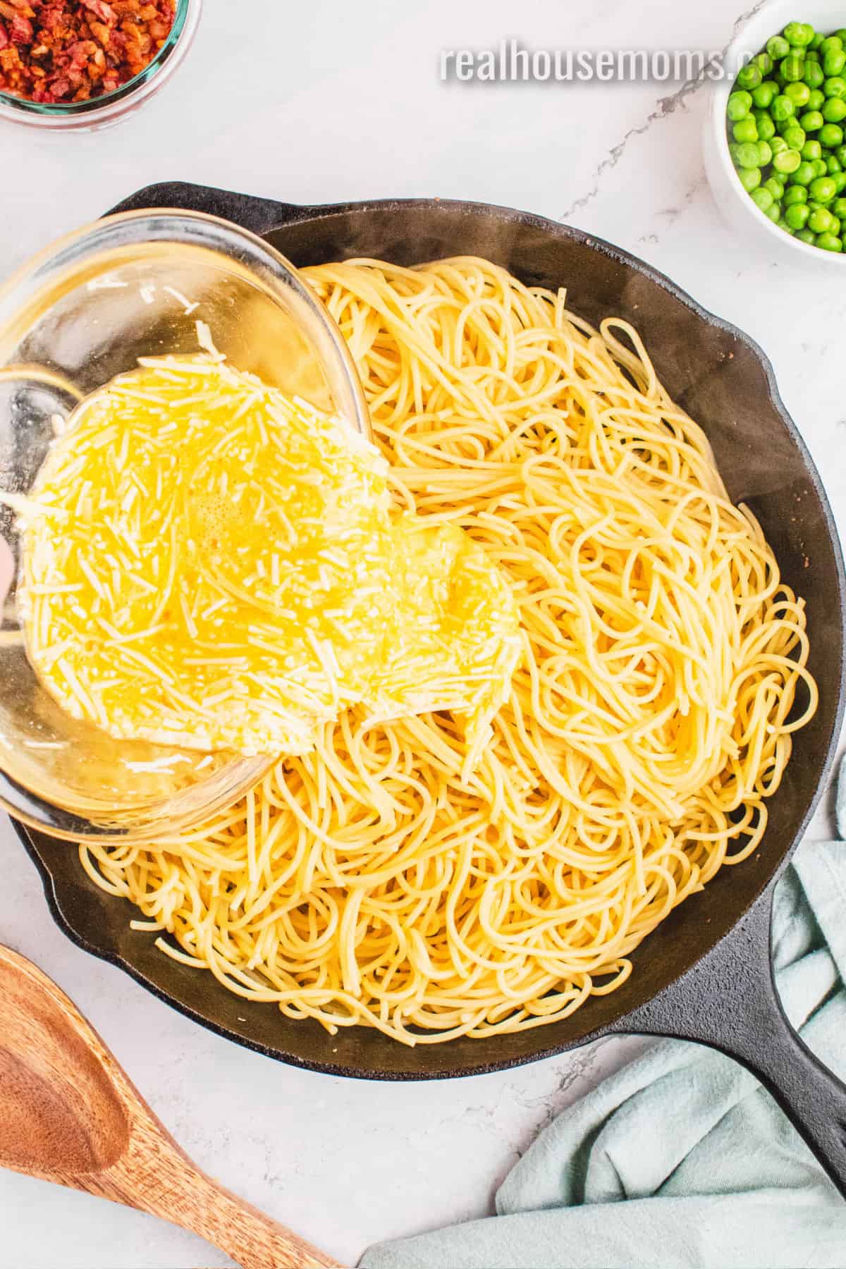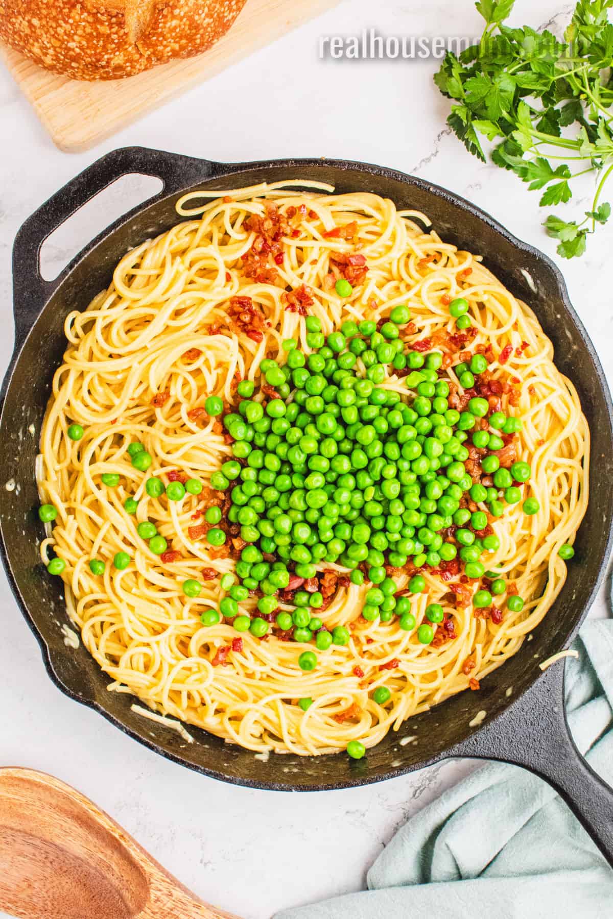 Veggies: Frozen English Peas (AKA sweet peas) – I know peas aren’t always a favorite, but in carbonara they’re GREAT! They add a slight sweetness, a pop of bright green color and easy nutrition!