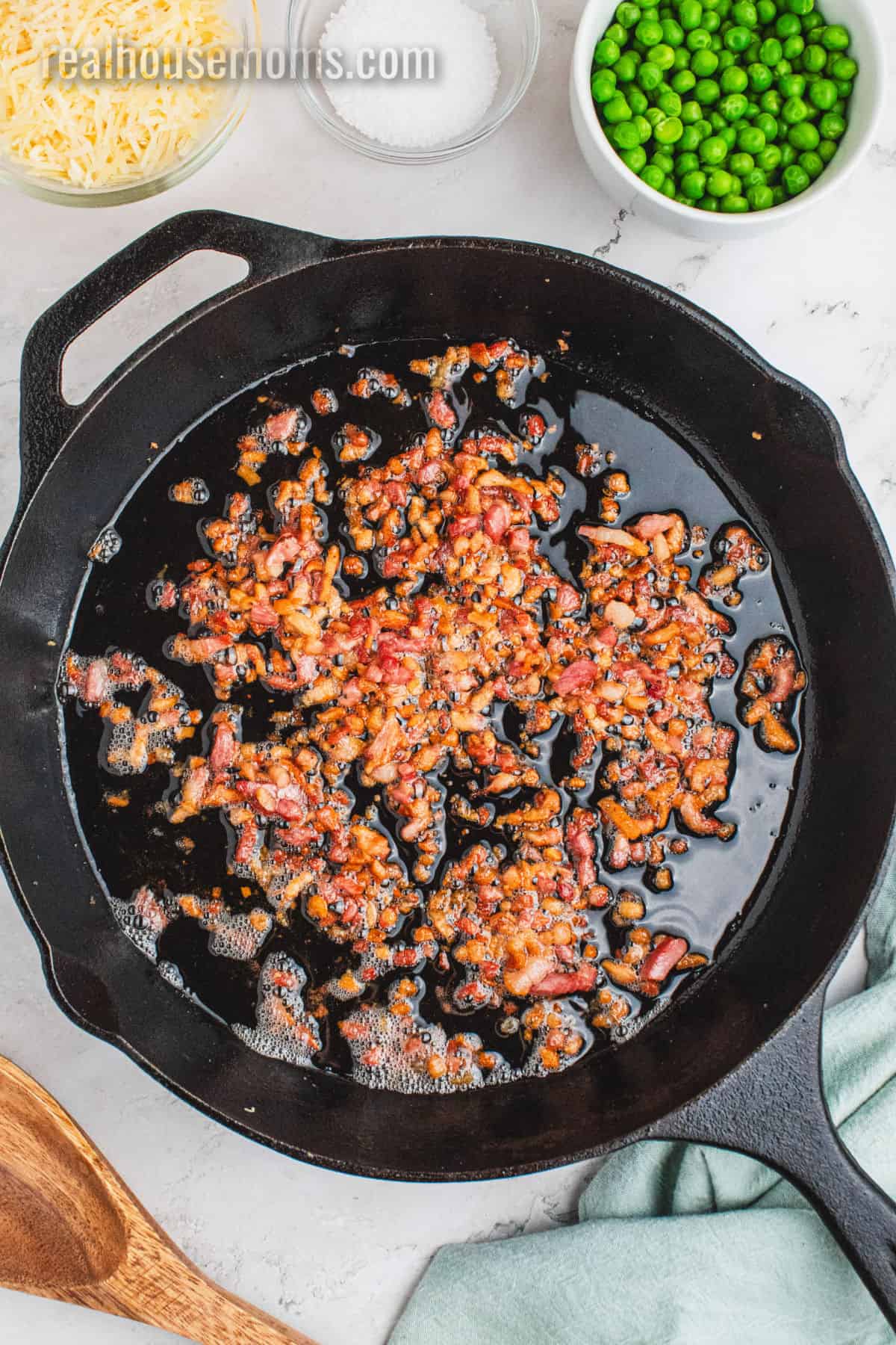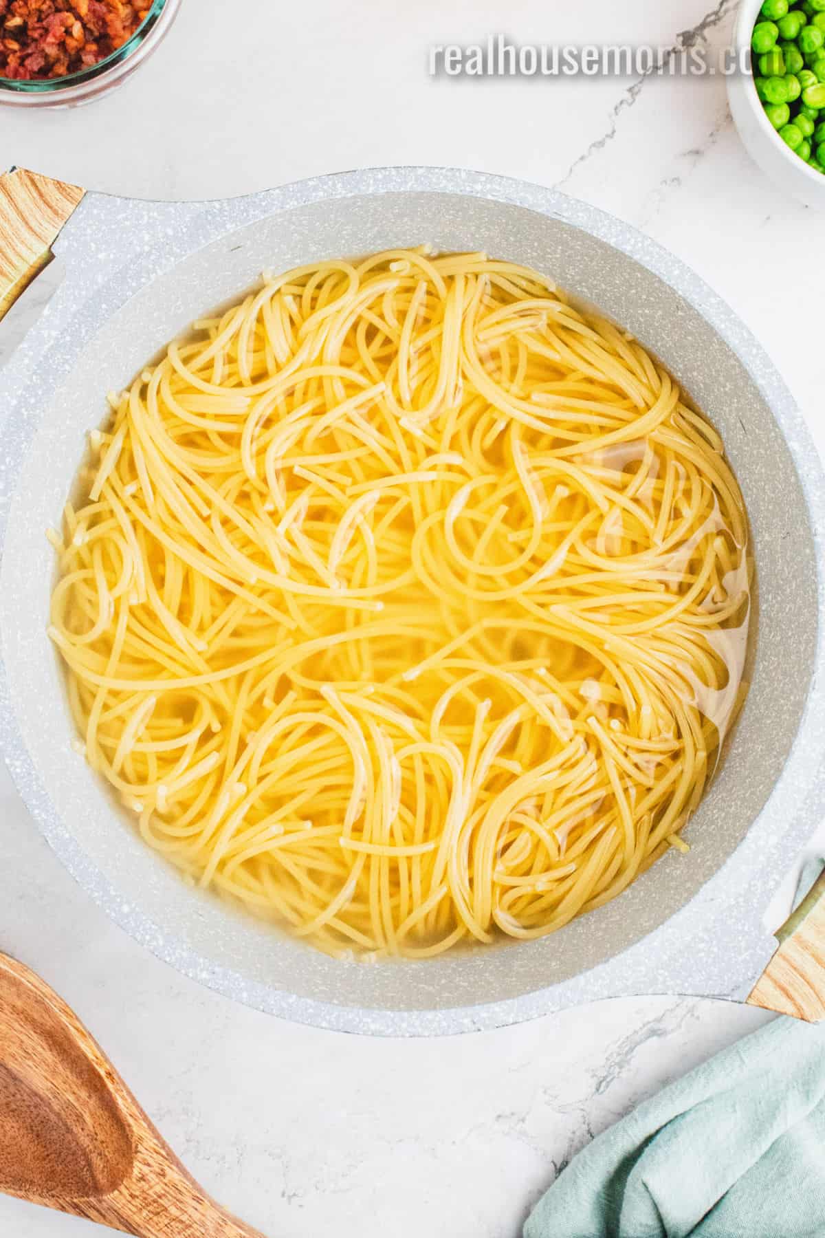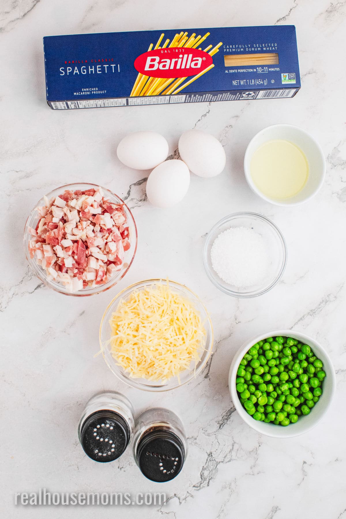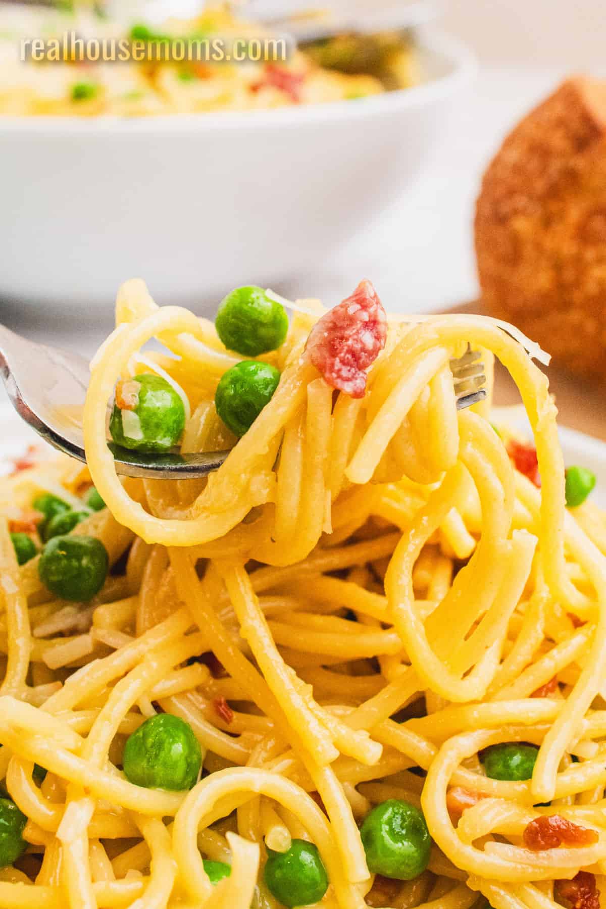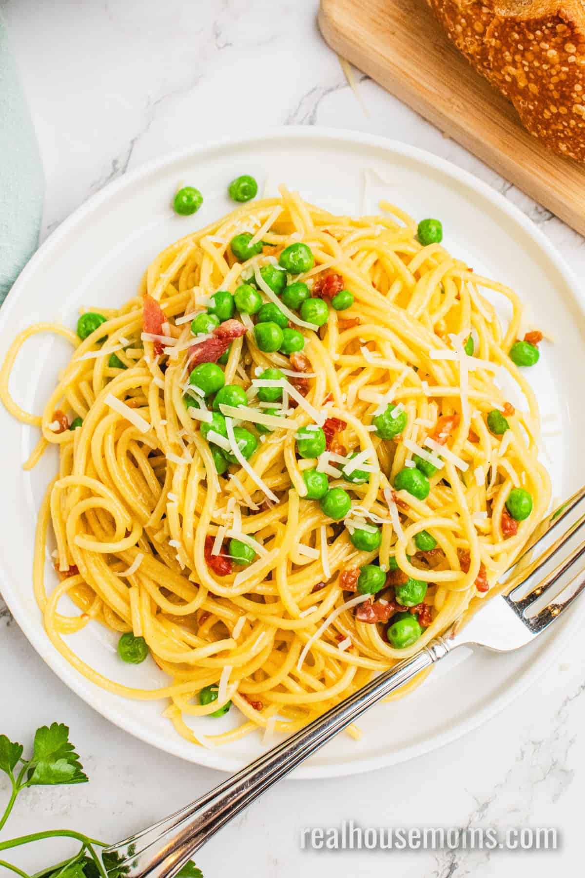 Veggies: Frozen English Peas (AKA sweet peas) – I know peas aren’t always a favorite, but in carbonara they’re GREAT! They add a slight sweetness, a pop of bright green color and easy nutrition!