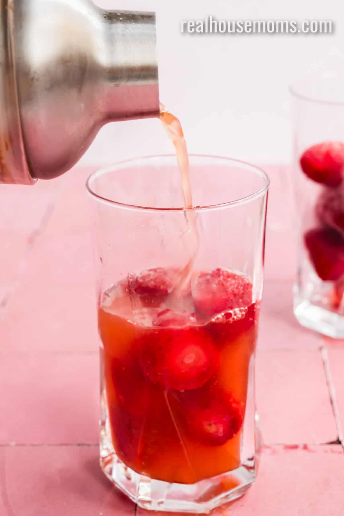 STEP TWO: Add the strawberry puree, more lemonade, Pimm’s liqueur, and ice to a cocktail shaker. Cover and shake until well chilled.