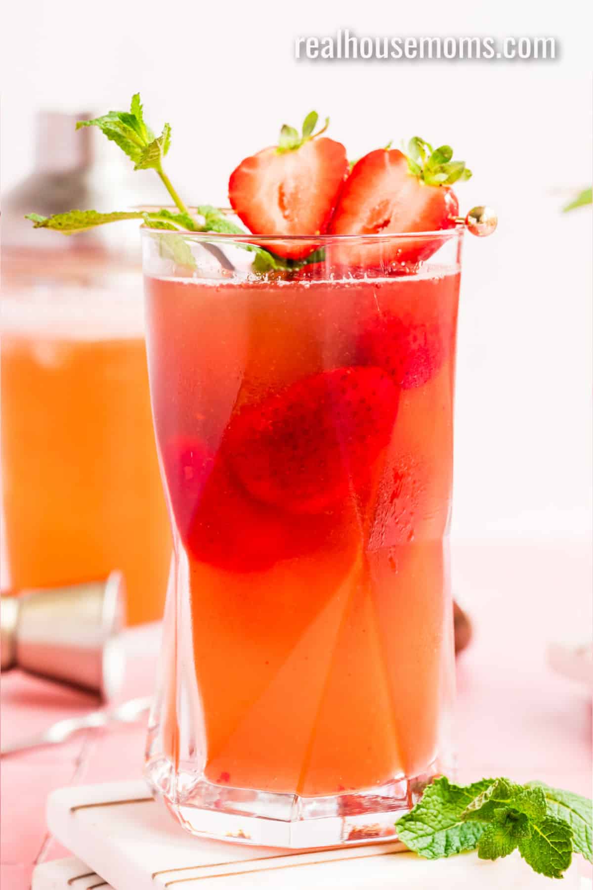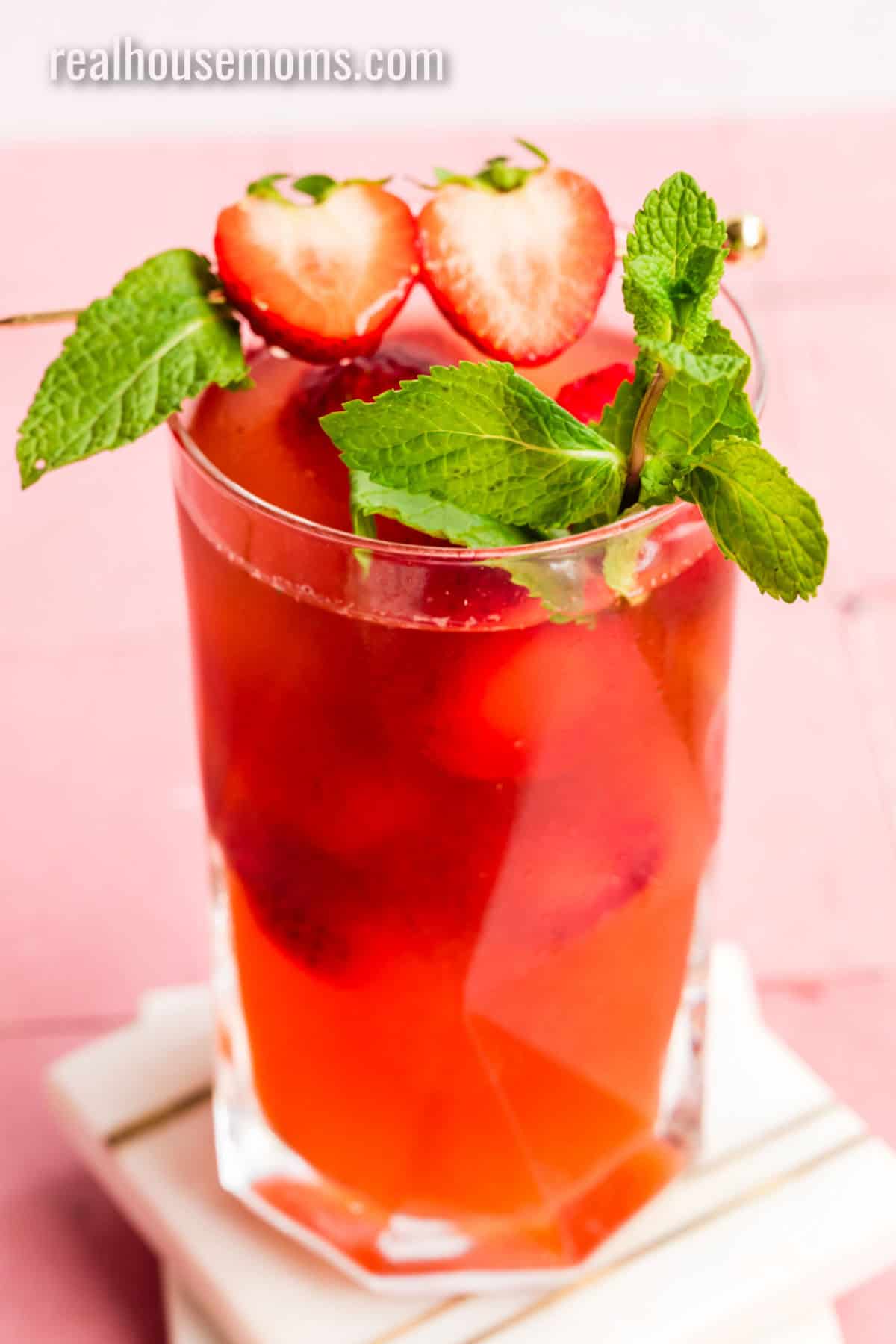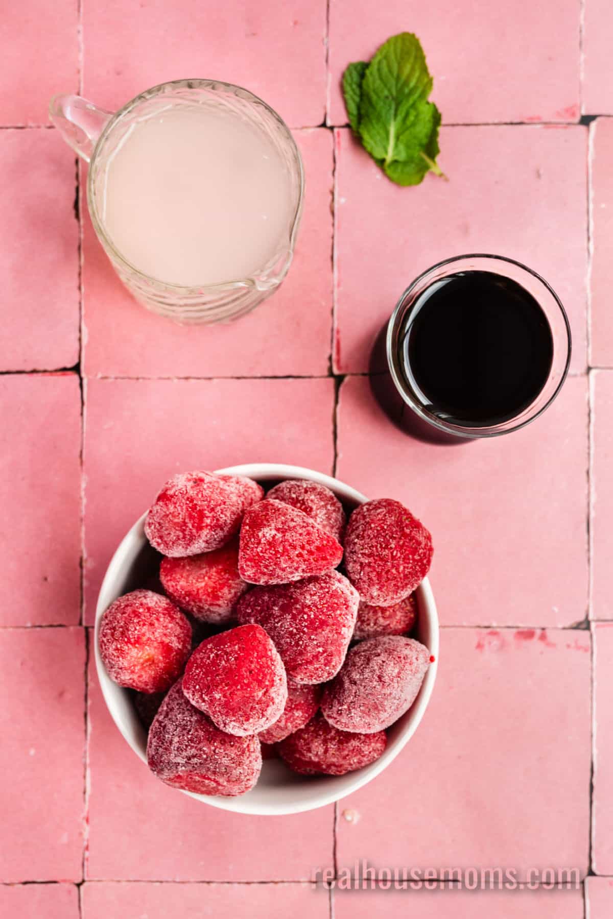 Produce: To make this drink, you will need strawberries and fresh mint. You are welcome to use frozen strawberries in this recipe, especially since they will keep the drinks cool! If using fresh strawberries, be sure to freeze some of them ahead of time.