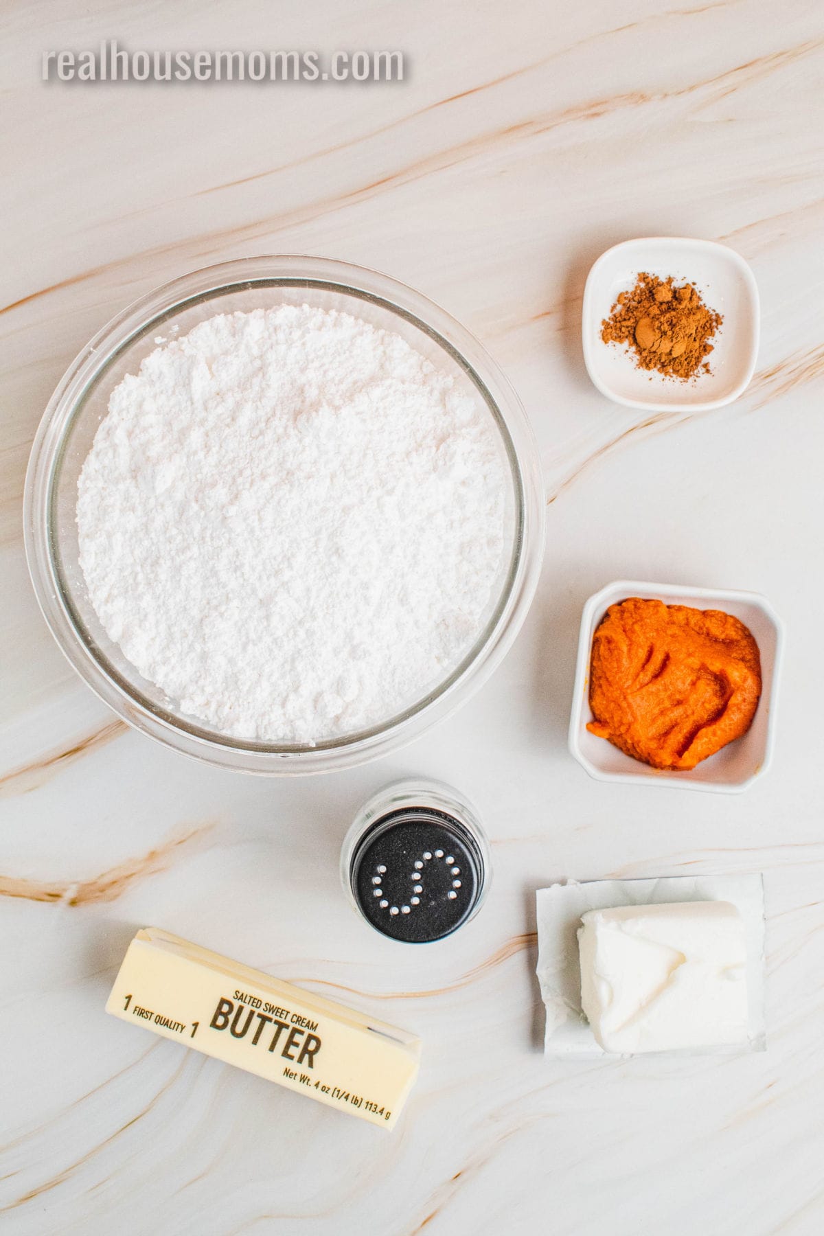 Frosting: To make the frosting, you will need butter, vegetable shortening, canned pumpkin puree, pumpkin pie spice, powdered sugar, and a pinch of salt. Be sure to grab pumpkin puree at the store and not pumpkin pie filling.