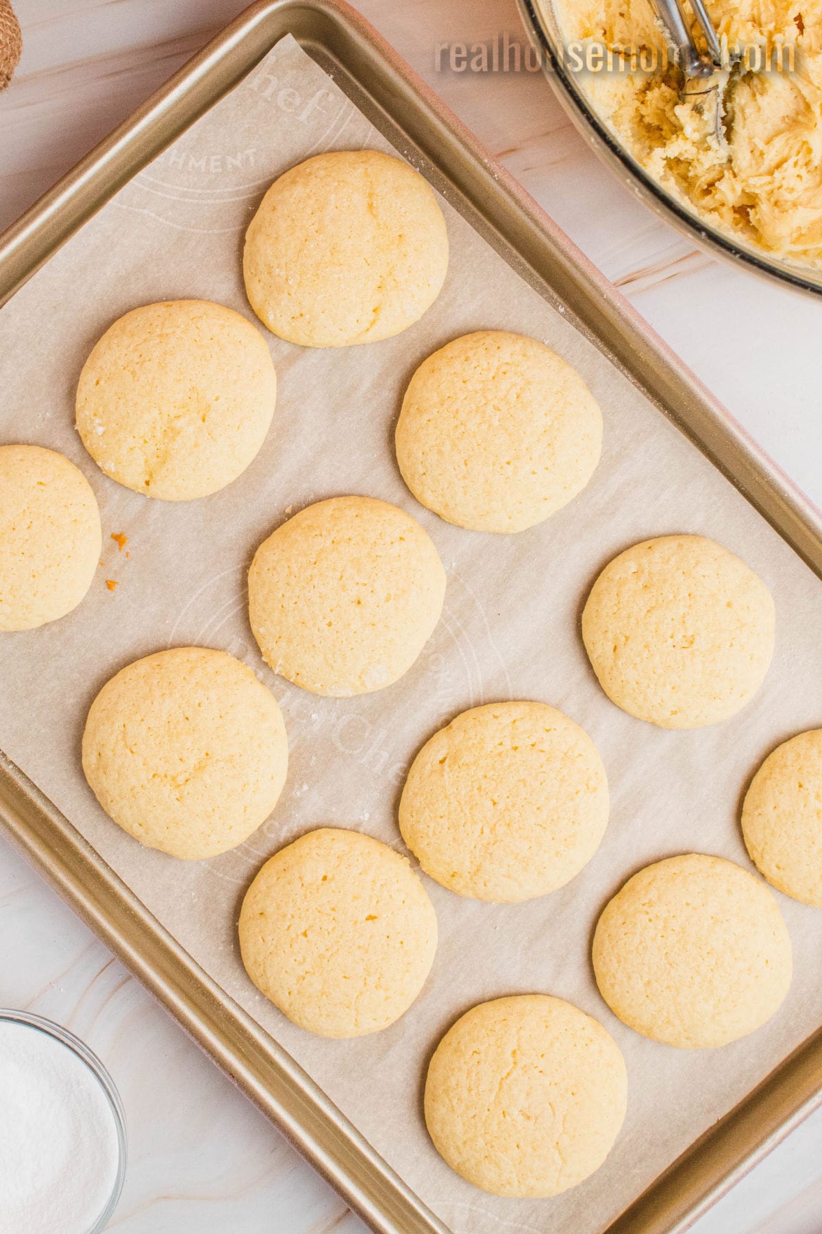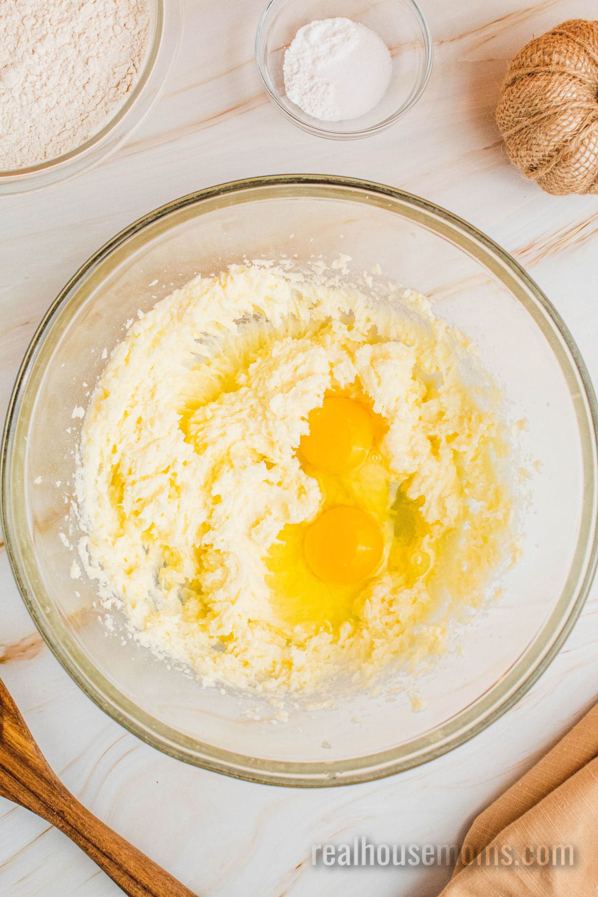 STEP ONE: Preheat the oven to 350 degrees F and set out a baking sheet. If you’d like, you can line your baking sheet with parchment paper for easy removal of the cookies. Using a stand mixer or a bowl and beaters, cream the butter, sour cream, and sugar together until smooth. Beat in the eggs followed by the vanilla.