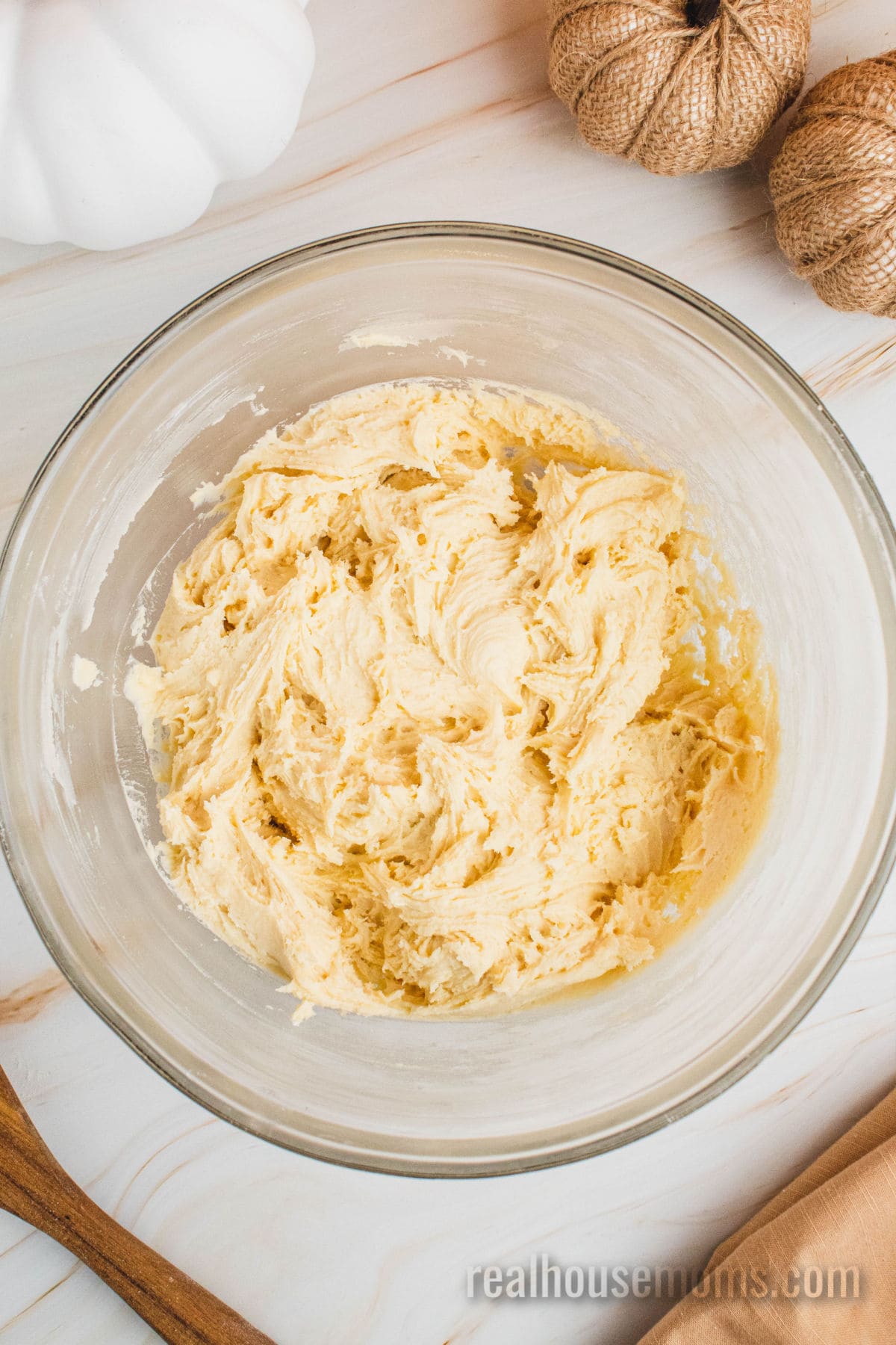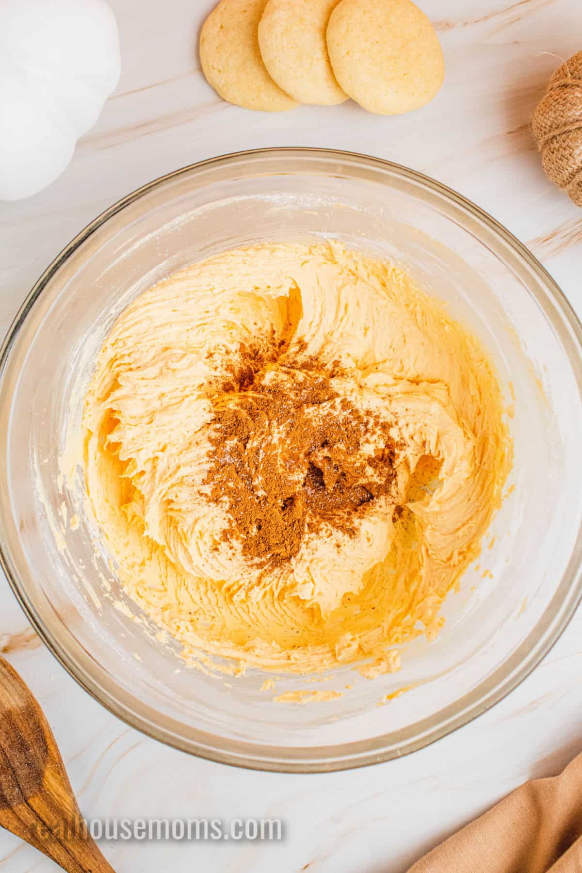 - Beat the butter and shortening together in a large mixing bowl, and then mix in the pumpkin puree. Add the powdered sugar to the bowl, one cup at a time, mixing after each addition. Mix in the pumpkin pie spice and salt. If frosting is too thick, add a little milk or water. If the frosting is too thin, add more powdered sugar as needed until your desired consistency is reached.