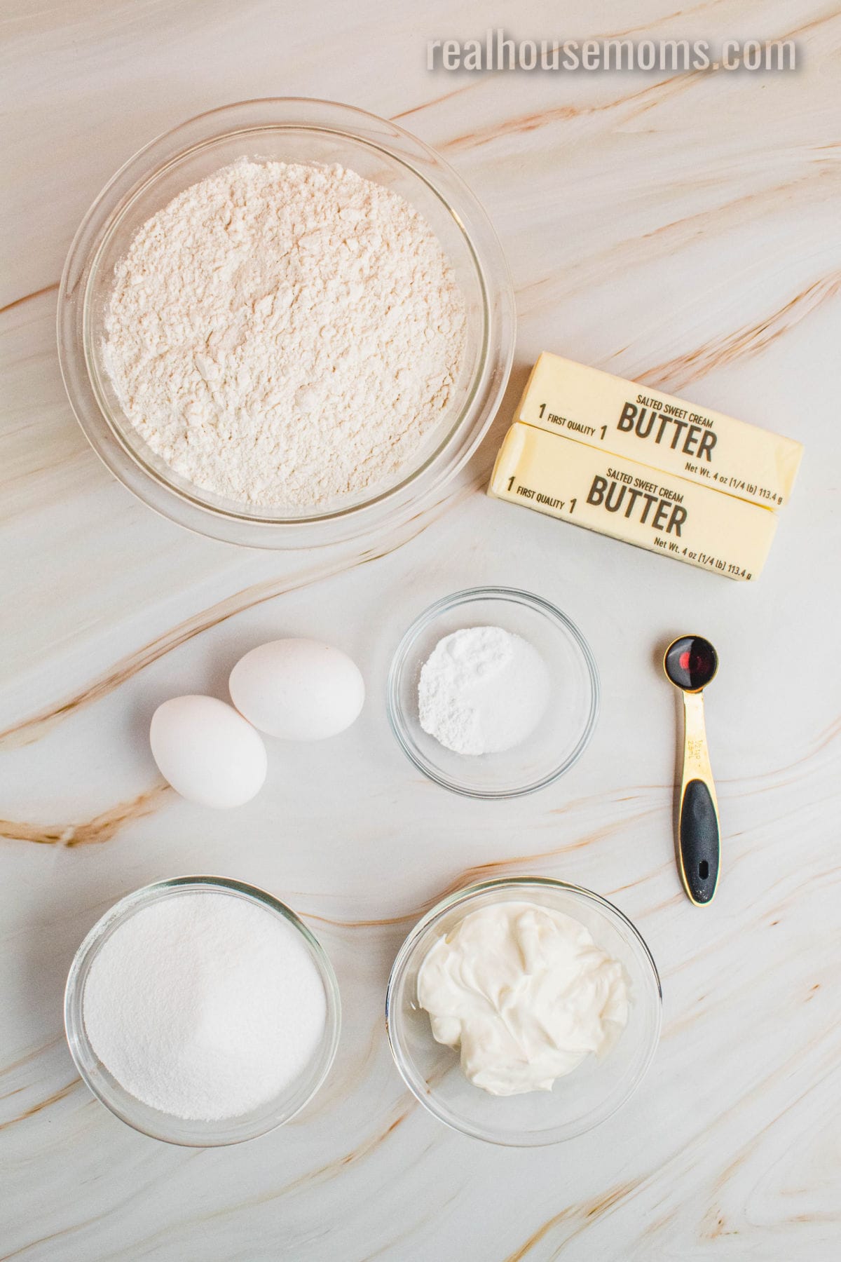 Cookie Wet Ingredients: Set out eggs, unsalted butter, and sour cream to come to room temperature, along with the vanilla extract.
