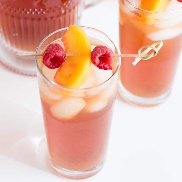 We start this tea off by making an infused simple syrup with peaches and raspberries – You can use fresh or frozen here, it doesn’t really matter. After we let them steep, we strain out the fruit, which I highly recommend saving to use on top of ice cream, yogurt, or even stirring into your morning oatmeal. What’s left is this brightly hued pink syrup that is candy sweet. So SO good! Once you have your syrup made you have a few options: Stir it all into a batch of tea (that’s what my directions indicate) or you can keep the syrup separate and stir it into each individual glass, which gives you the option to make it as sweet as you’d like – and use the syrup for other things (hellooo cocktails!).
