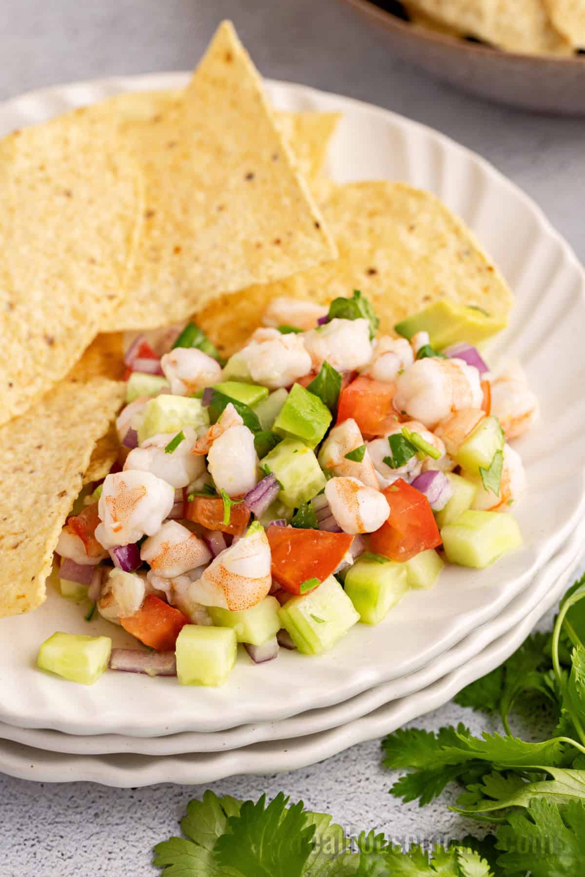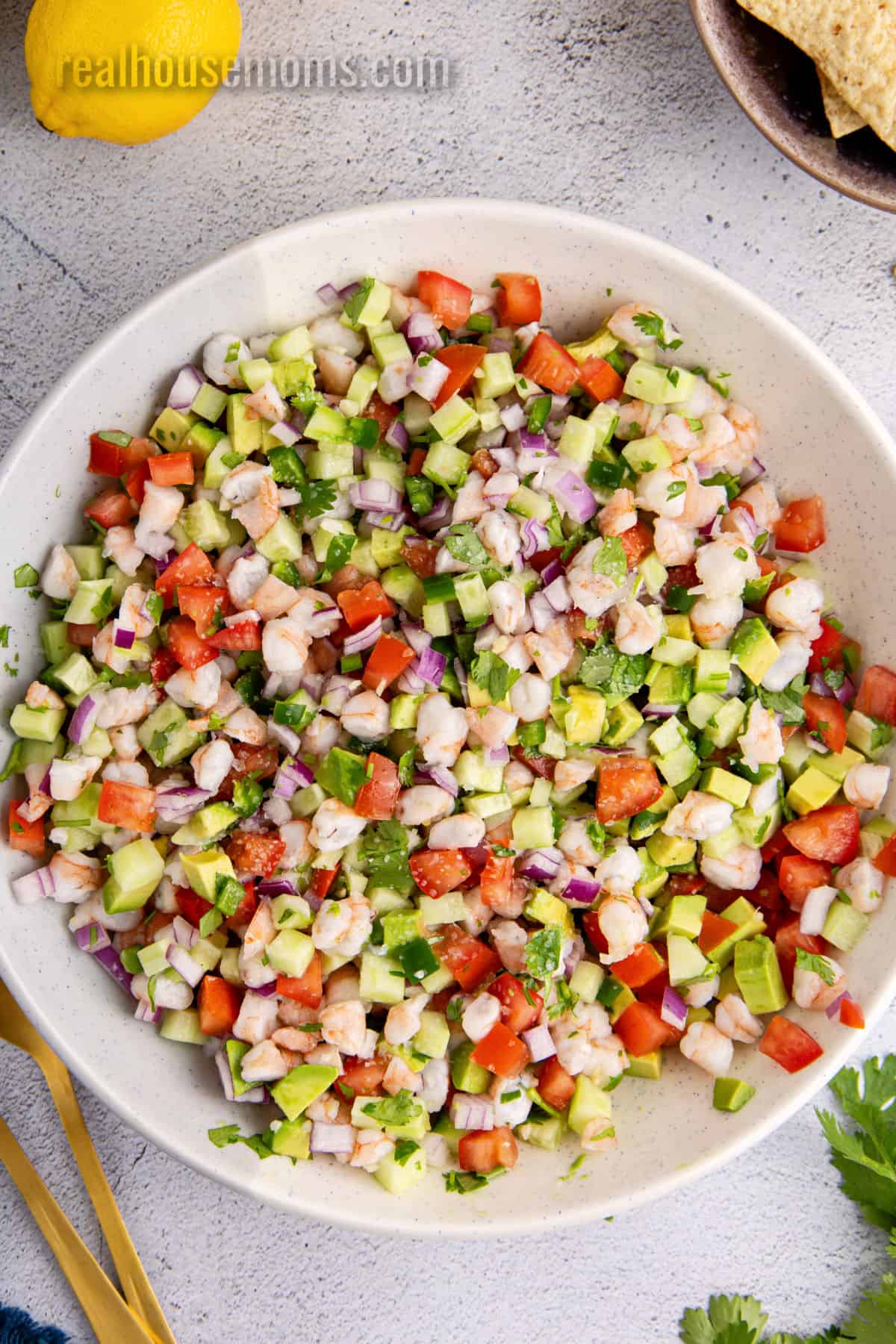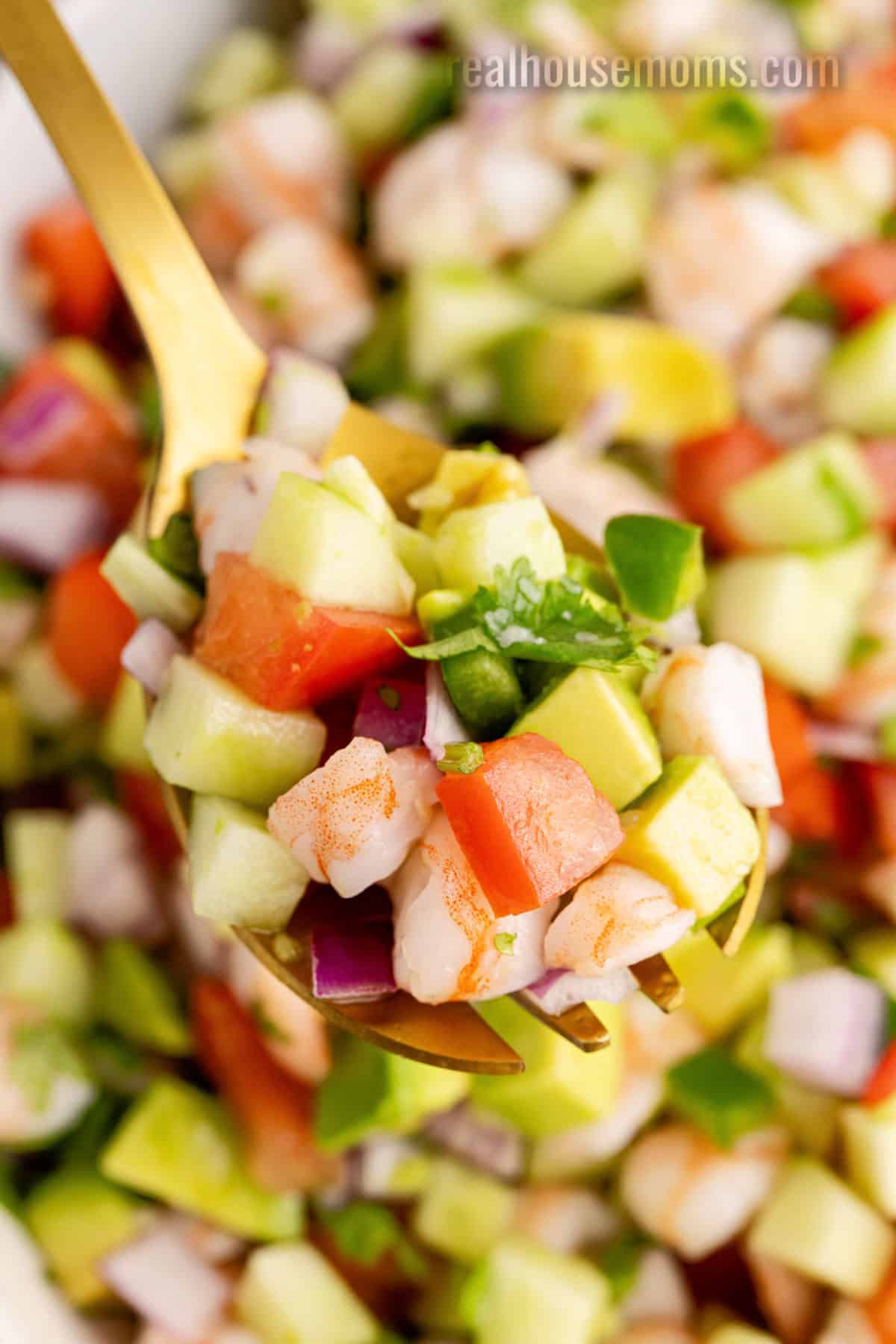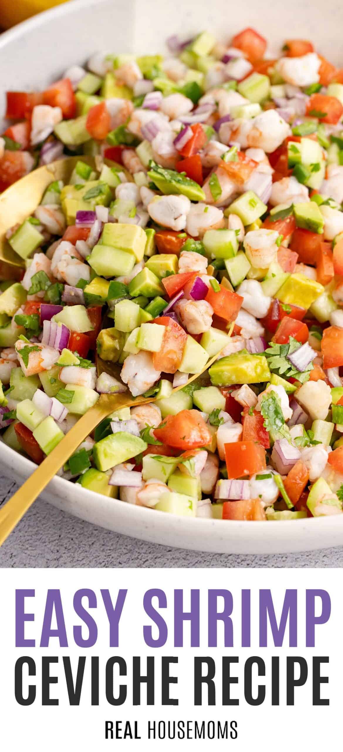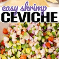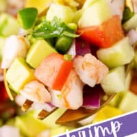Shrimp ceviche is a fresh summer appetizer with shrimp marinated in citrus juice, mixed with avocado, cucumber, tomatoes, onion & jalapeño.