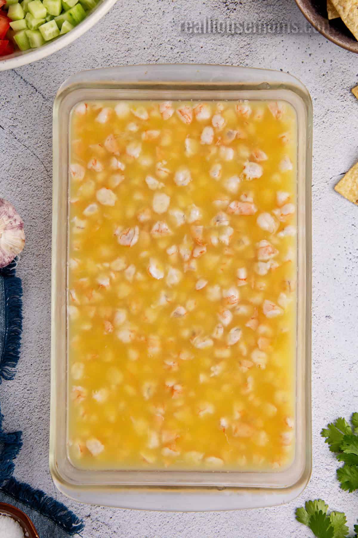 STEP ONE: Start by cutting the shrimp into small bite-sized pieces so they cure quickly and evenly in the citrus juice. As they chill, the shrimp will gradually lose their translucent appearance and turn opaque, with a pinkish-white color throughout. You want them to look plump and firm, but still tender. If they start to curl tightly or feel dense, they’ve gone a little too far. Tip: Make sure the shrimp are fully submerged in the juice, with no pieces sitting above the surface, so everything cures at the same pace.