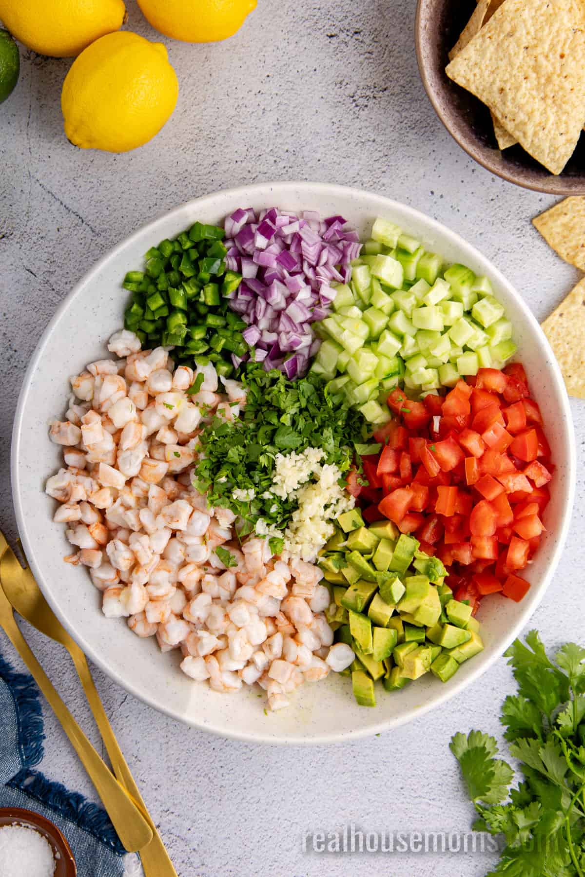 No two versions are exactly alike! It can be made with fish, scallops, or shrimp and served as a dip, light lunch, side, or appetizer, depending on the region and ingredients used. Some recipes are bright and citrus-forward, while others bring more heat and bold seasoning. This version stands out for its crisp, refreshing texture and three-citrus marinade, which gives the shrimp a brighter, slightly sweeter finish than lime-only ceviche.
