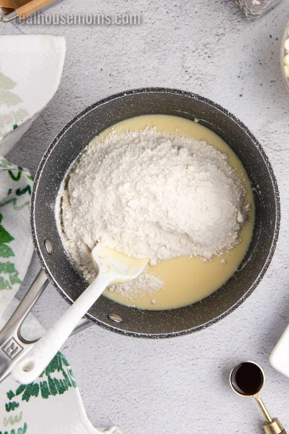 - In a medium saucepan, warm the sweetened condensed milk over low heat. Add the sugar cookie mix and stir together until combined.