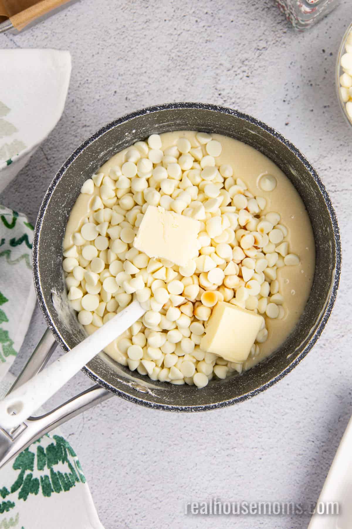 STEP TWO: Add the white chocolate chips, butter, and vanilla. Stir until just melted and smooth. Do NOT cook too hot or too long.