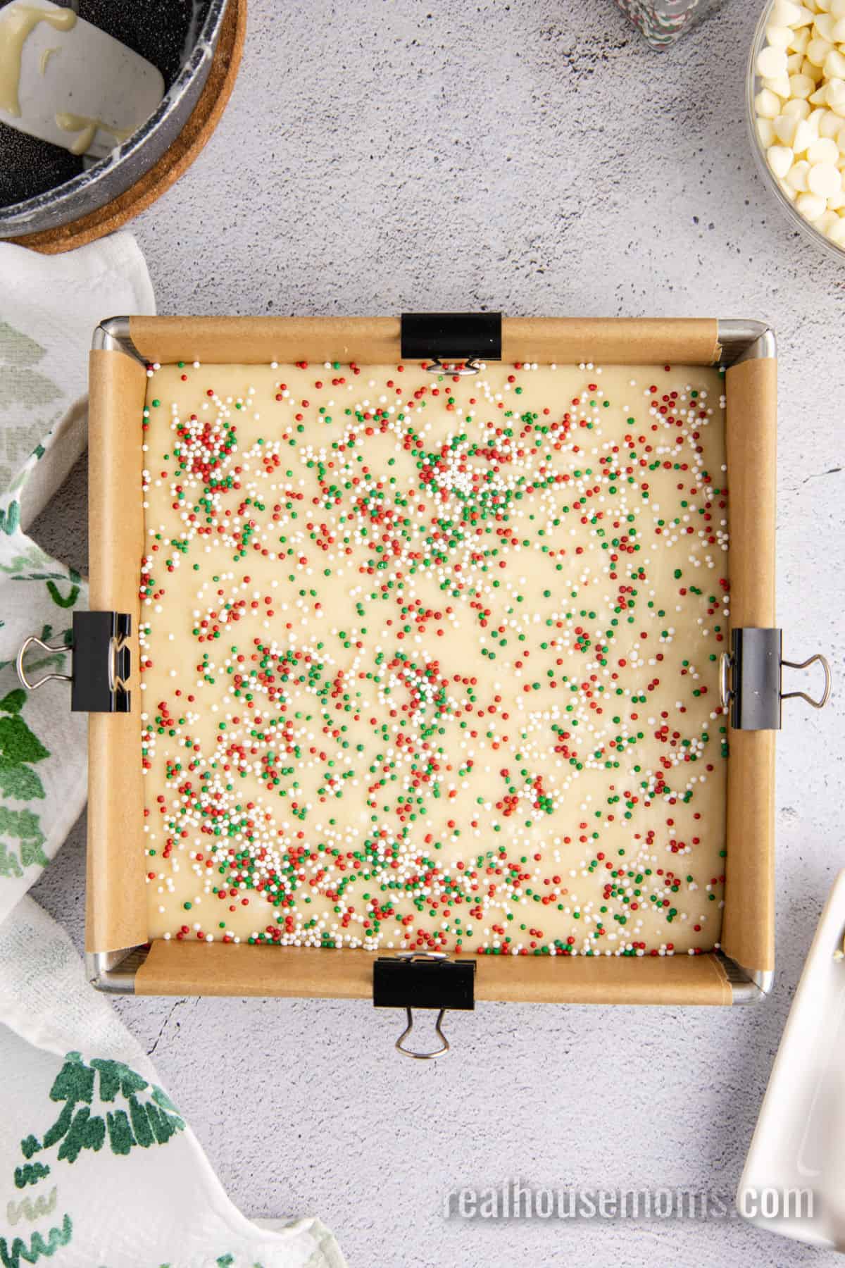 - Pour the fudge mixture into the prepared baking pan, spread it into an even layer, and top with sprinkles.