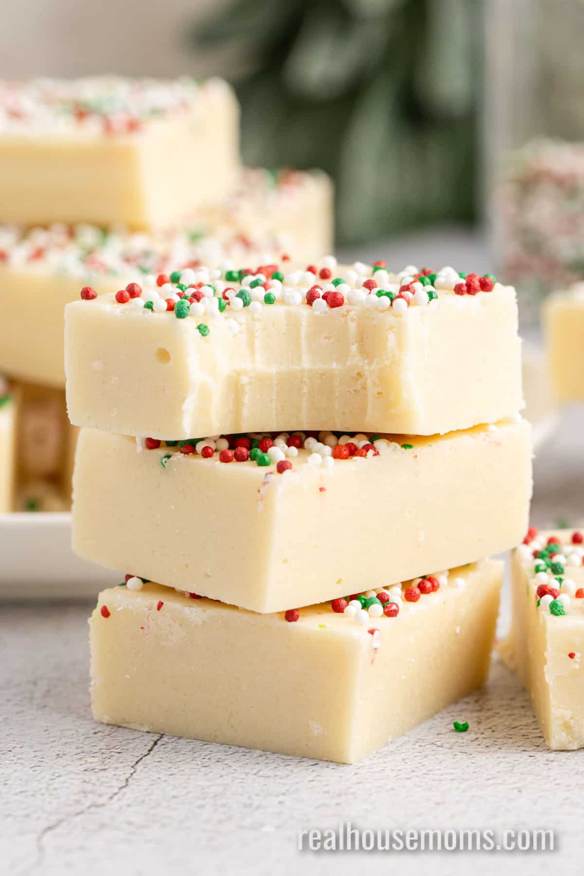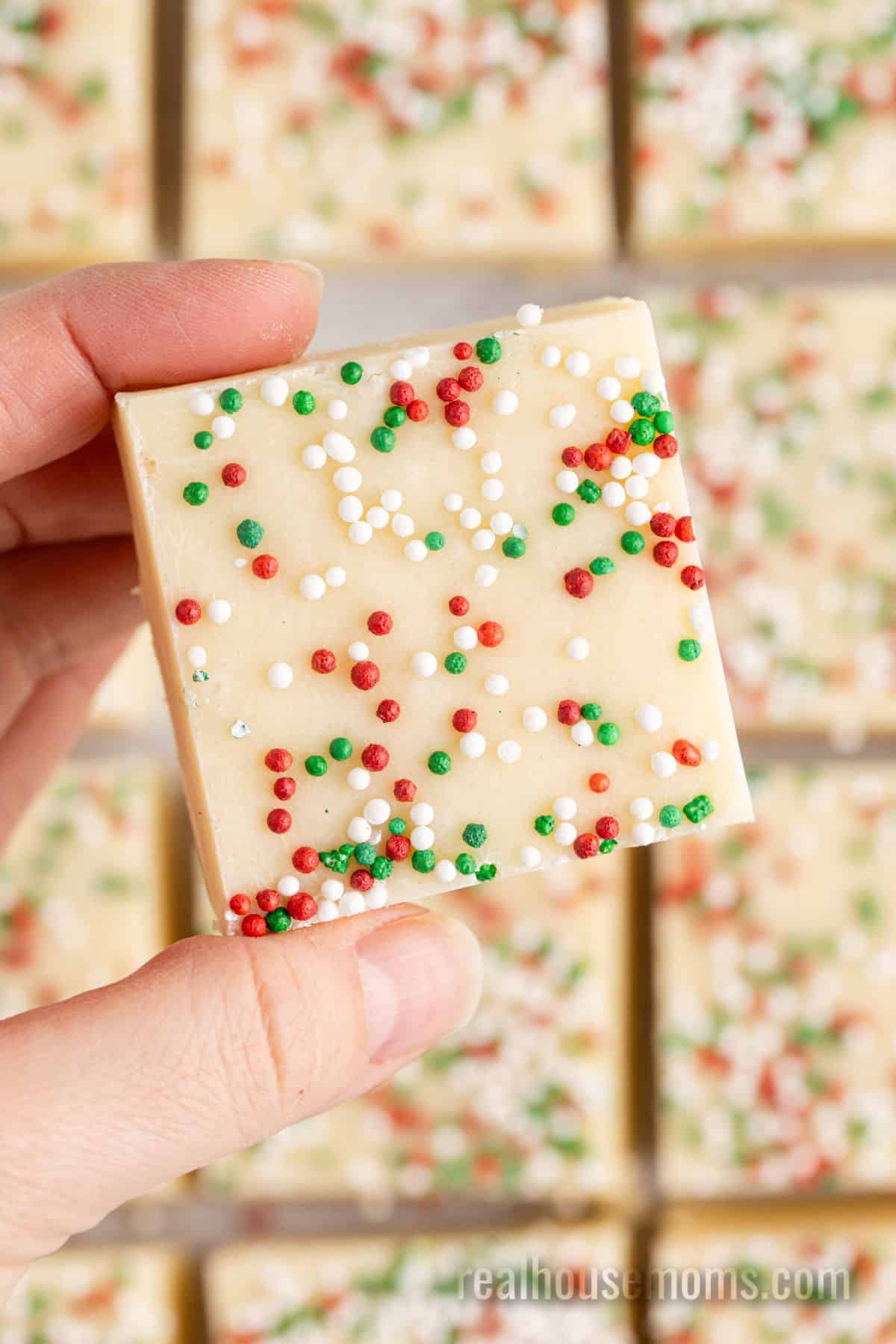 Sugar Cookie Fudge is a 5-ingredient, super-easy recipe that brings all the vanilla flavor of cookies without bringing the work! Featuring a store-bought cookie mix, sweetened condensed milk, butter, vanilla, and white chocolate chips, these festive little fudge squares are topped with red & green sprinkles for the perfect addition to your parties and get-togethers!