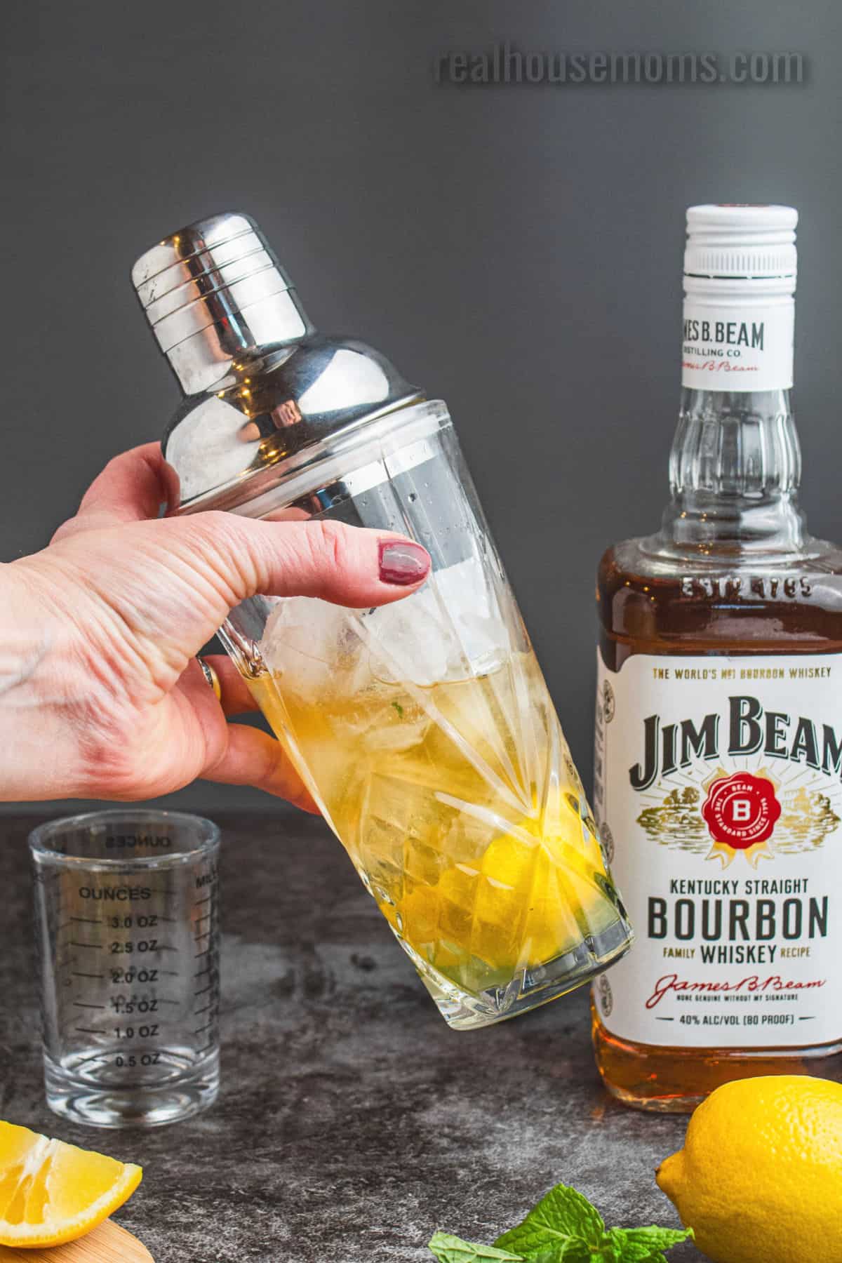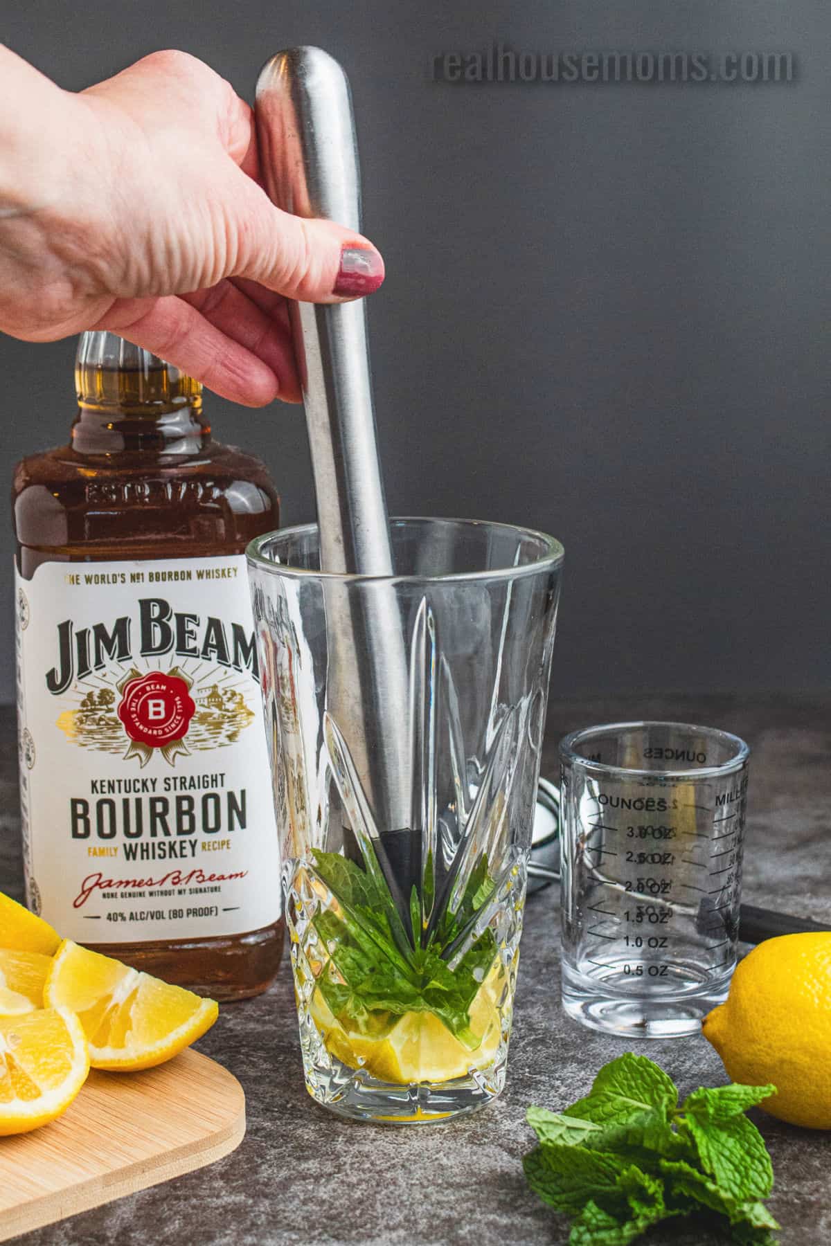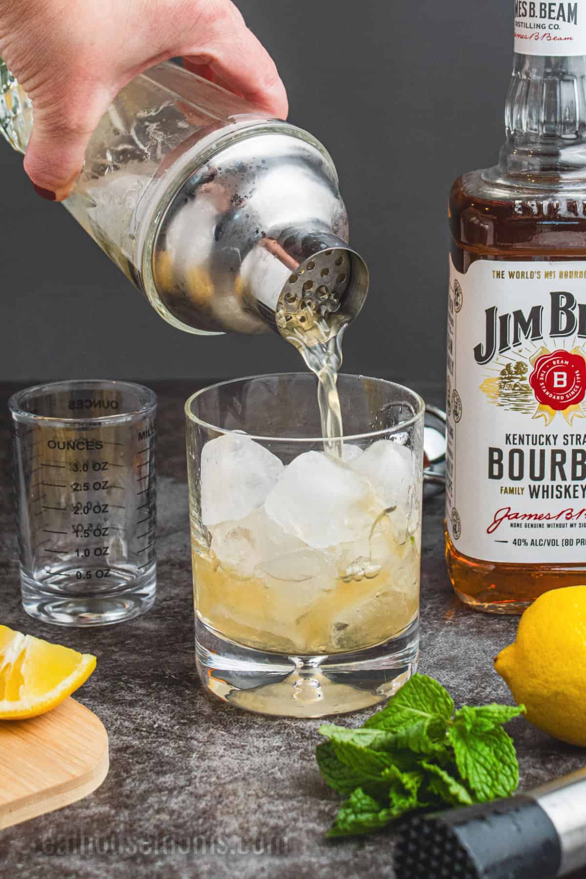 Liquor: Bourbon is the right whiskey choice for this smash cocktail!