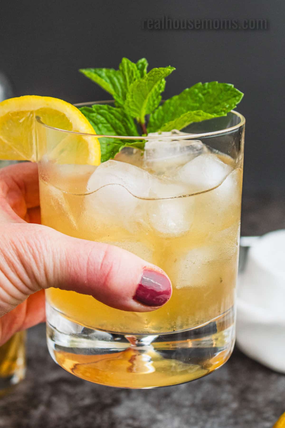 - Strain into a rocks glass filled with ice. Garnish with mint leaves and a lemon slice on the rim. Serve immediately.