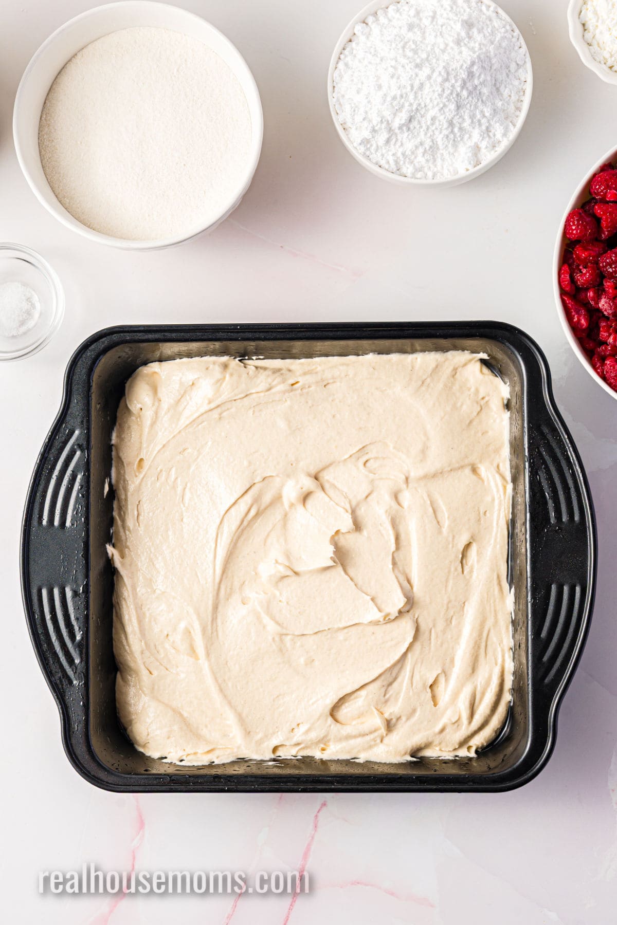 - While the cake bakes, prepare the raspberry sauce by adding the frozen raspberries, powdered sugar, cornstarch, and salt to a small saucepan. Stir to combine.