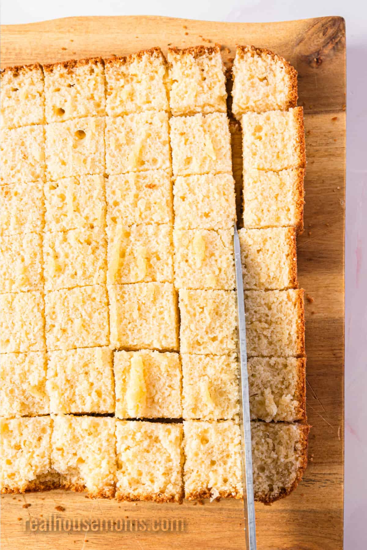 - Remove from the oven and cool completely in the pan on a wire rack. Once cooled, remove from the pan. Cut the cake in half horizontally, then cut into small cubes. It's easiest to cut the cubes while the cake halves are still stacked.