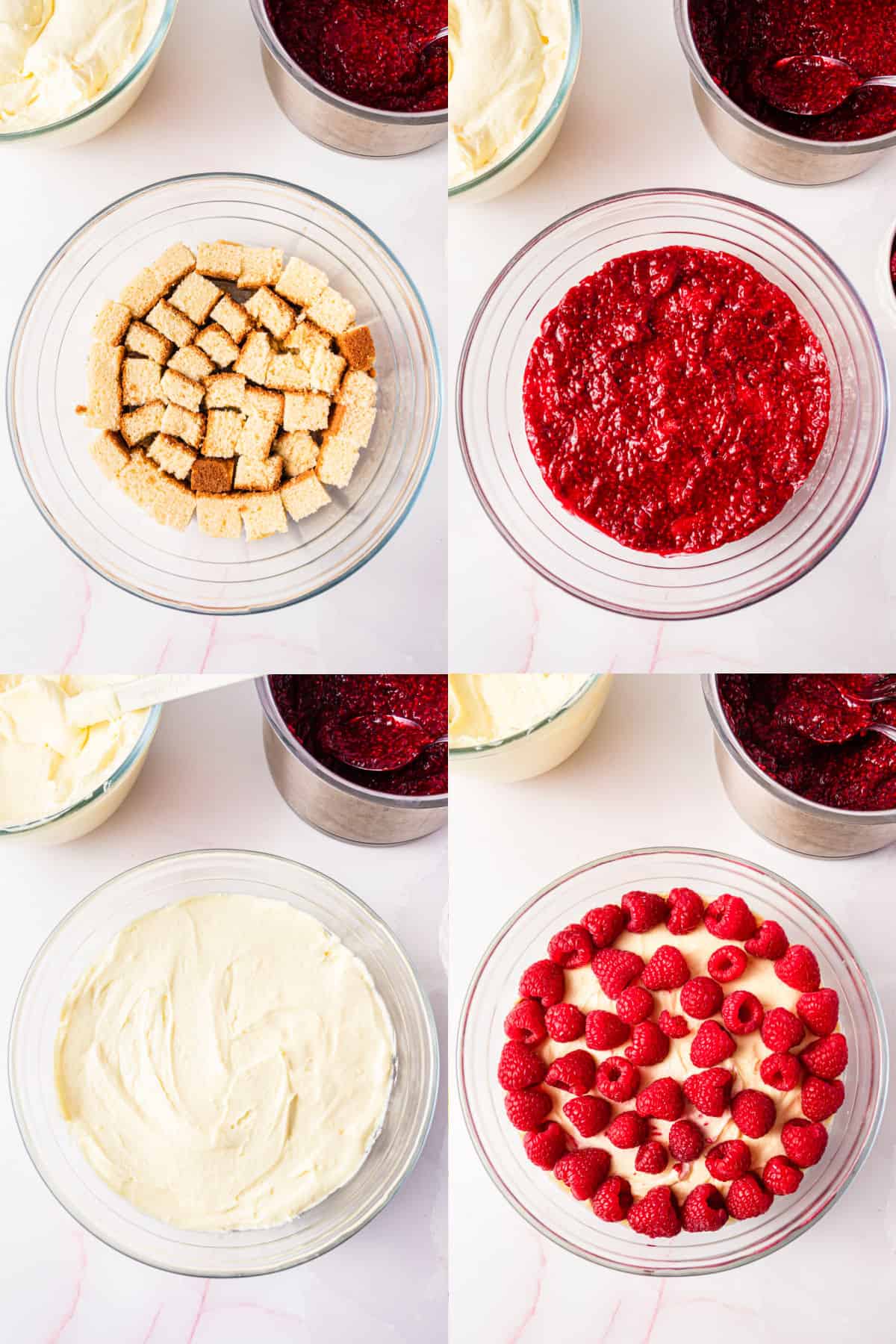 STEP SIX: To assemble the trifle, arrange half of the cake cubes along the bottom of a trifle dish or large glass bowl. Spread half of the raspberry sauce over the top, followed by half of the white chocolate cream, and a layer of fresh raspberries. Add the remaining cake and white chocolate cream, then finish with the raspberry sauce.